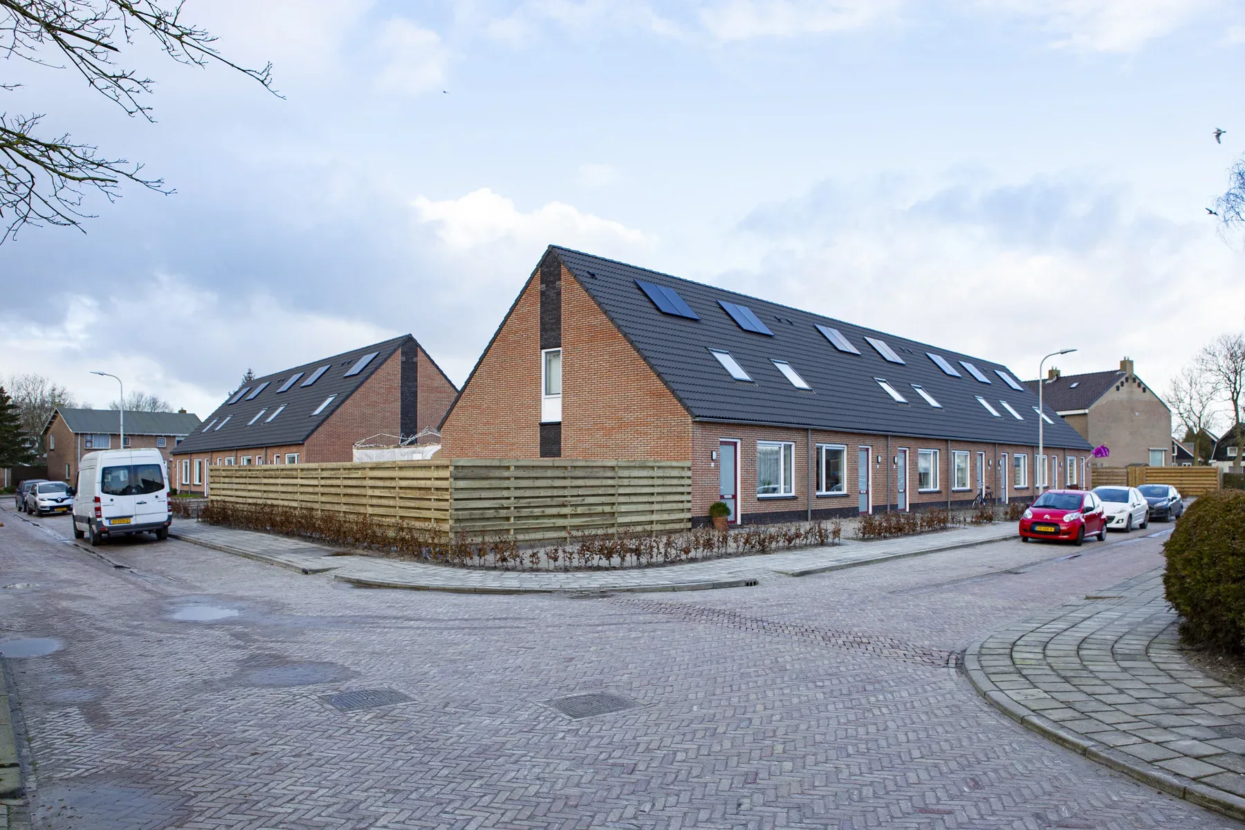 Om de woningen ook op energiegebied toekomstbestendig te maken hielden we de gasleiding buiten de deur. De woningen worden verwarmd via een lucht-water-warmtepomp. Die staat in de aangebouwde gemetselde, geschakelde berging. De buitenunit komt op het platte dak van die berging. Dankzij optimale isolatie en zonnepanelen op het dak komen de huizen uit op een EPC van 0,4. Op esthetisch gebied zorgde onze architect Penta uit Harlingen voor een mooie aansluiting bij de omgeving, door te werken met gele gevelsteen en oranje dakpannen. In de kopgevels zit een strook metselwerk in een contrasterende bruine steen, gelijk aan die van de plint.
