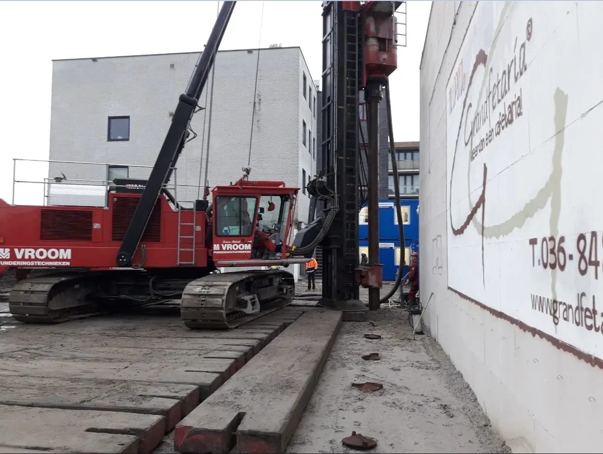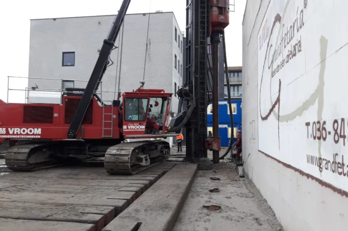 Om tussen twee gebouwen in te kunnen bouwen, maken we gebruik van geprefabriceerde holle wanden, waarin we na het plaatsen beton storten. Door de wapening aan de vloer te koppelen, kunnen we de wanden op een afstand van enkele centimeters langs de bestaande bebouwing plaatsen. De constructie is daarmee opzichzelfstaand. De gevelafwerking sluit naadloos aan op de naastgelegen gebouwen.