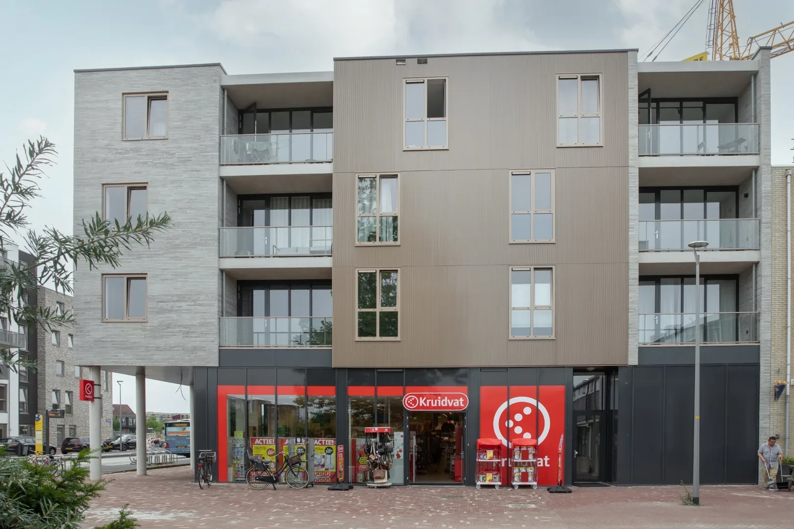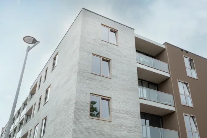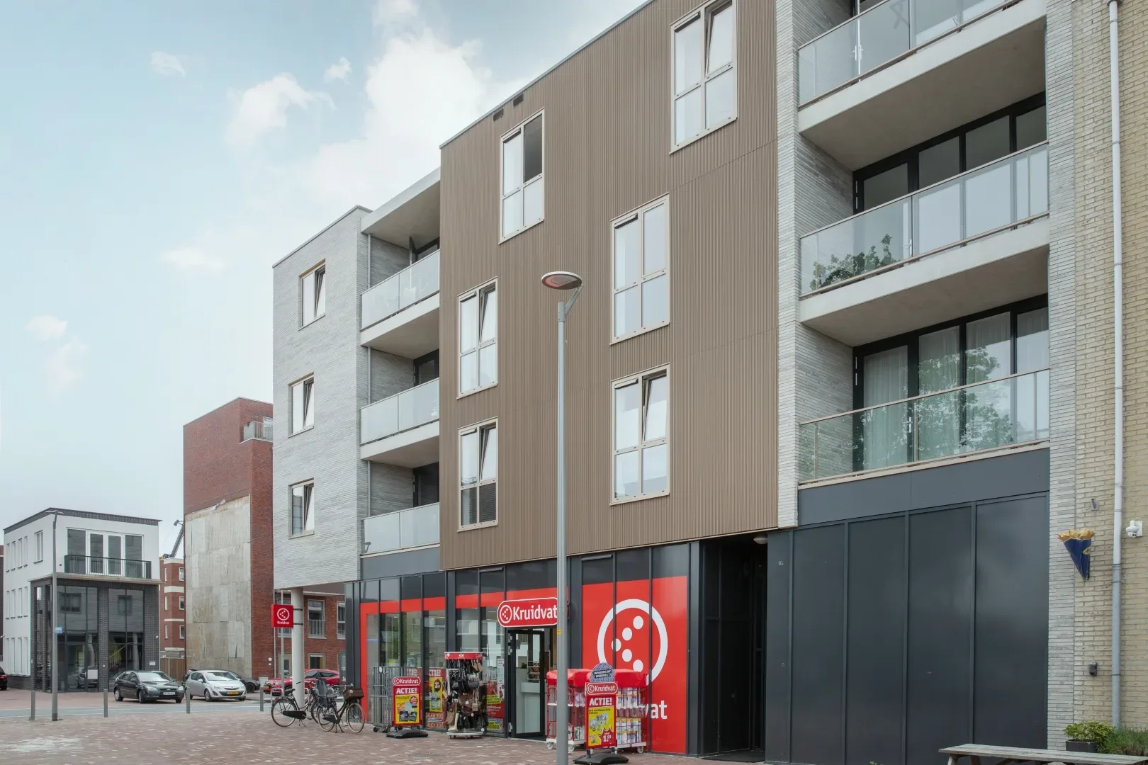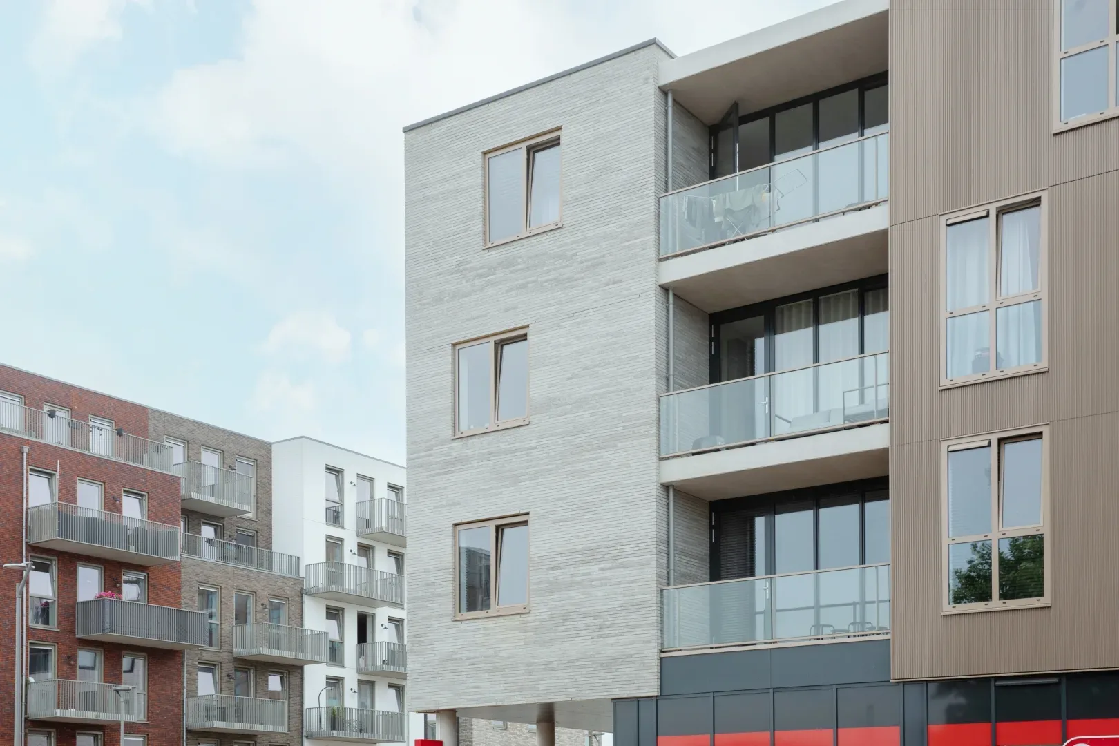 Dit wordt een complex met een zeer eigen uitstraling. De houtskeletbouw wordt bijvoorbeeld bekleed met een aluminium gevelplaat. Voor het metselwerk gebruiken we geen doorsnee steen, maar een steen van 60 centimeter lang – drie keer langer dan normaal. Dat zorgt voor een heel bijzonder gevelbeeld.