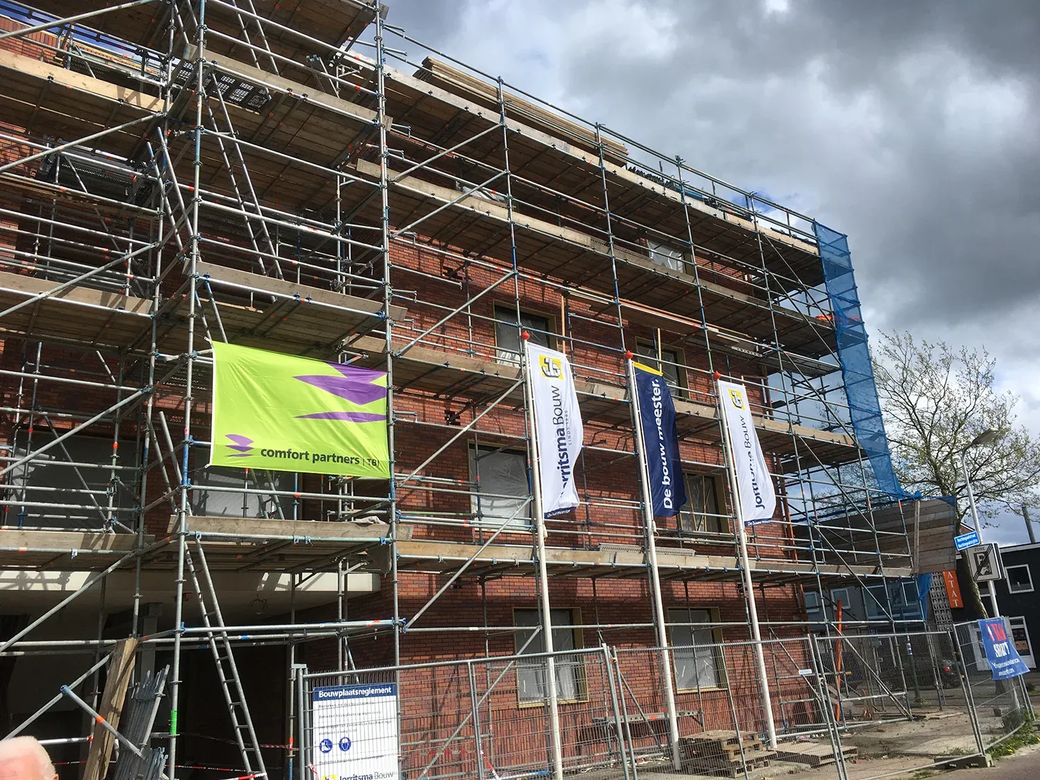 De basis voor deze woningen wordt gevormd door mortelschroefpalen – deze geven minder trillingen dan heipalen zodat overlast voor de omgeving wordt beperkt. Daarop zijn breedplaatvloeren gelegd. Na plaatsing van installatiewerk en wapening zijn de vloeren afgestort; we hebben inmiddels de derde verdieping bereikt. Aan de hand van een strak leverschema zijn de woningscheidende wanden geplaatst. In de komende periode monteren we de houtskeletbouwelementen op de begane grond.