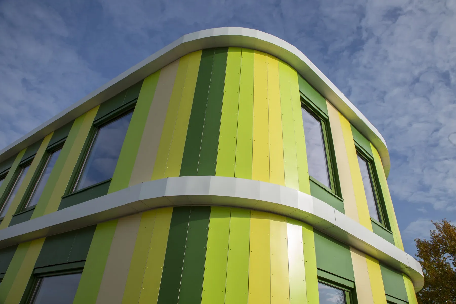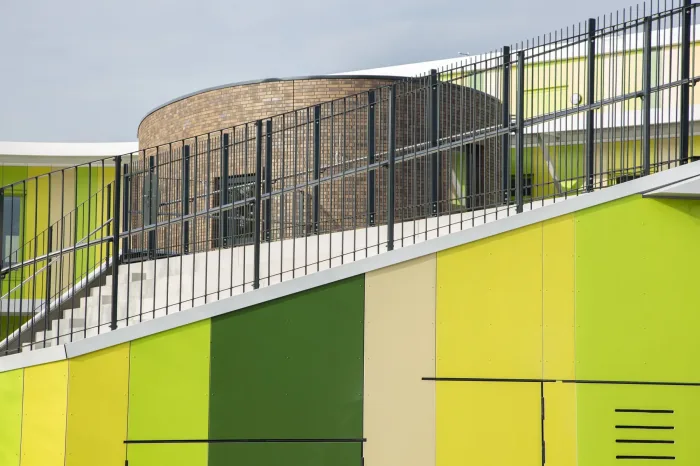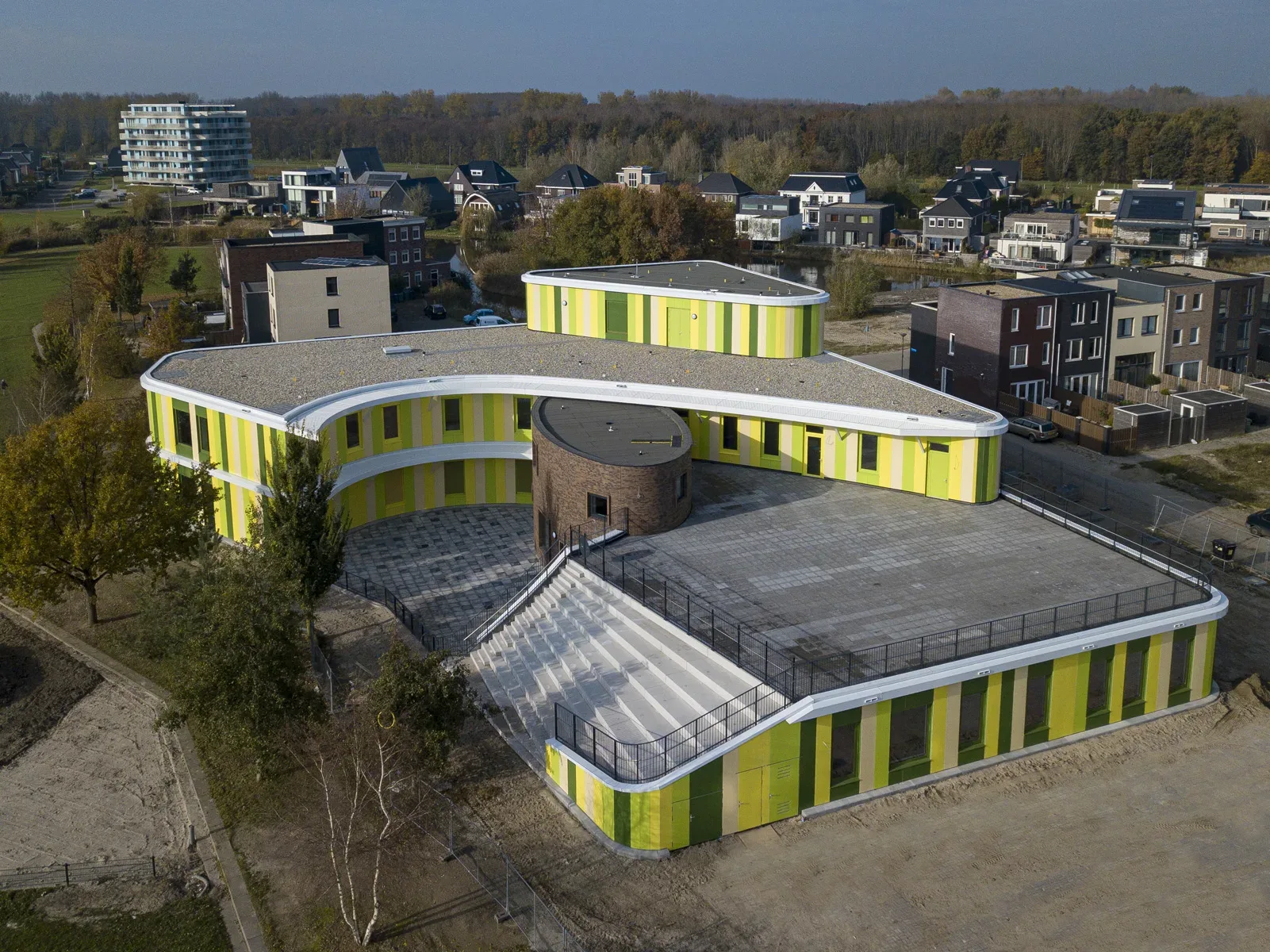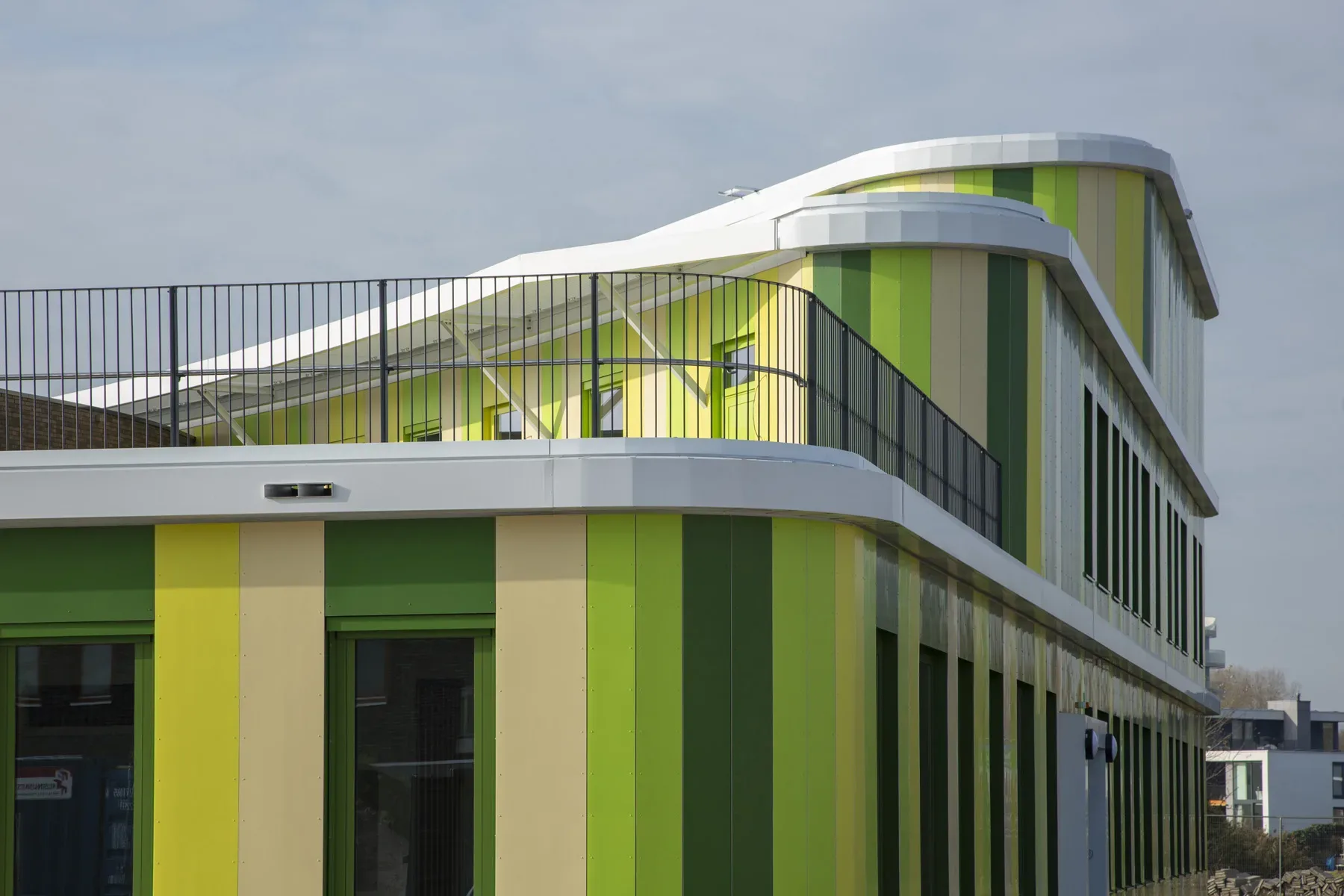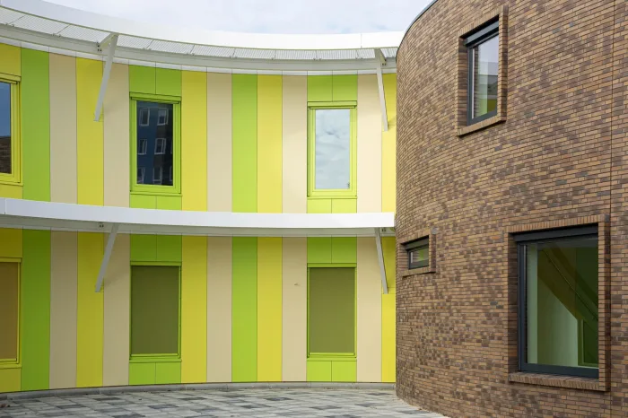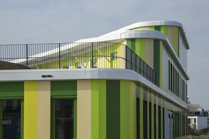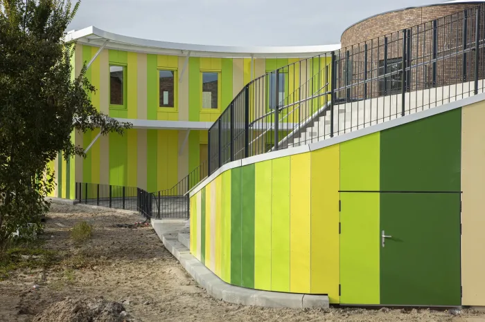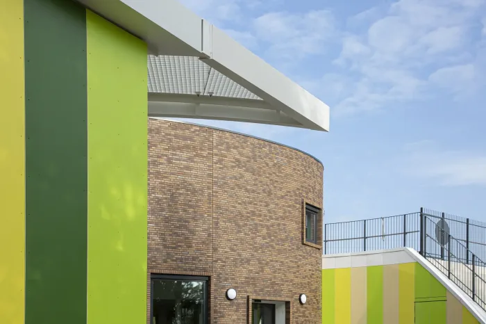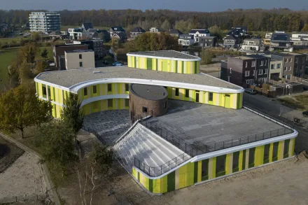 Het gebouw met zijn rondlopende gevels gaat fraai op in de groene omgeving. De architect heeft op een spannende manier buiten de lijntjes gekleurd door de entree op de eerste verdieping te situeren. En door het gebouw te voorzien van een dakterras/buitenlokaal, waar kinderen les kunnen krijgen in de buitenlucht. Een gevel met rondingen heeft in de detaillering extra aandacht nodig. We hebben het HSB-pakket erop aangepast om de gevraagde isolatiewaarde te borgen. Volgens het bestek moeten de binnenwanden afgewerkt worden met zgn. ‘clickwall’ – verglijkbaar met clicklaminaat. Dit systeem kan op de ronde wanden minder goed worden gemonteerd. Daarom passen we op deze plaatsen HPL toe in dezelfde structuur en kleur als de clickwall. Ook de glazen pui vormde een uitdaging, want aan de raamzijde moeten ook stopcontacten komen. Hiervoor hebben we – wederom in het voortraject – in overleg met de installateurs een goede oplossing gevonden. De installateur zal de inbouwdozen voor stopcontacten voorzien van luchtdichte manchetten om zo de luchtdichting te garanderen.