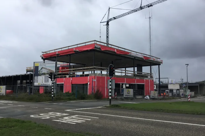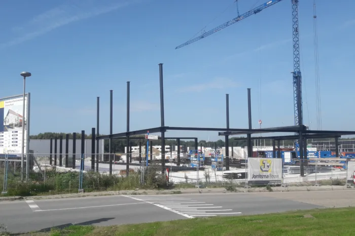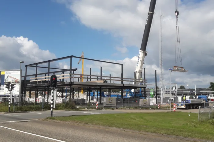 We bouwen in een hybride systeem: staalskelet met kanaalplaatvloeren, gevelsluiting met houtskeletbouwelementen met daarop trespa. Een deel van de binnenwanden bestaat uit vellingblokken in een staalconstructie. Deze wanden worden schoon afgewerkt, wat met name rond de aansluitingen vakmanschap vraagt. In het ontwerp is daarnaast een schijngevel opgenomen die is vervaardigd uit strekmetaal. Dit geeft een heel mooie aanblik. Het is wel een onderdeel dat de nodige aandacht behoeft. Met zorgvuldige engineering en montage zorgen we er samen met de leverancier voor dat het resultaat wordt zoals de architect dat voor ogen had. Dat zijn processen die we beheersen, zodat de werkzaamheden tijdens de bouw op rolletjes lopen.
