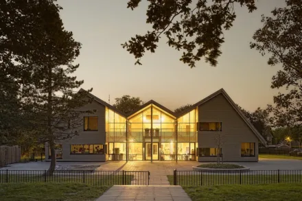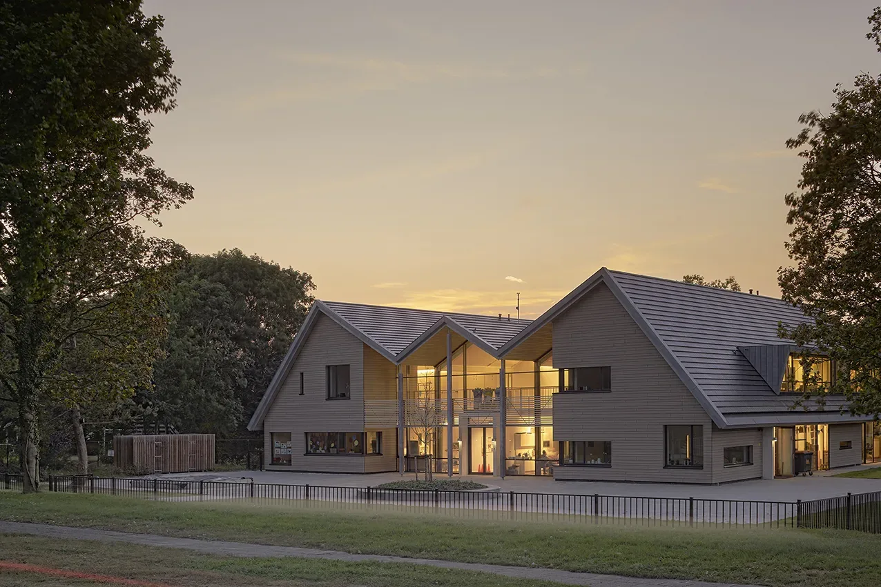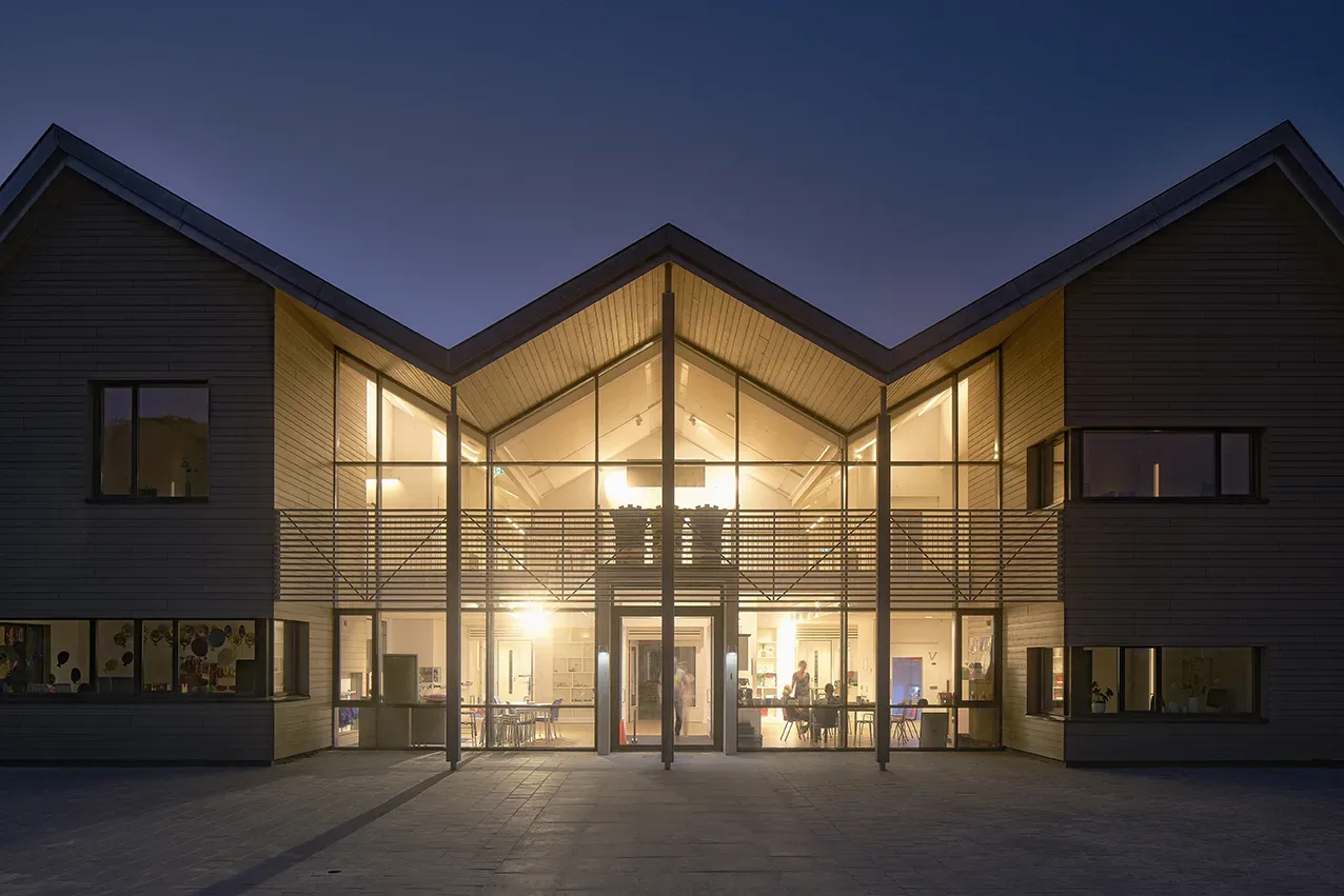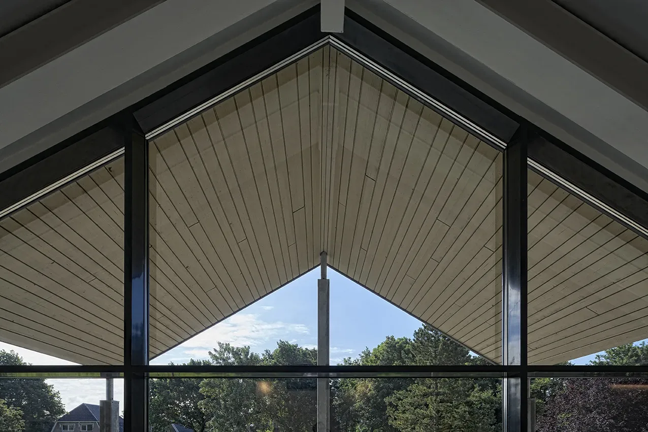 Voor de isolatie adviseerden we al in het voortraject om het systeem Isobouw Slimfort® te gebruiken. Bij dit systeem ontstaan – in tegenstelling tot de oorspronkelijk geplande houtskeletelementen – geen koudebruggen. Verder plaatsten we aluminium (buiten) en houten (binnen) kozijnen. Aan de voor- en achterzijde bevinden zich vliesgevels, tussen de lokalen en gangen paneelwanden.