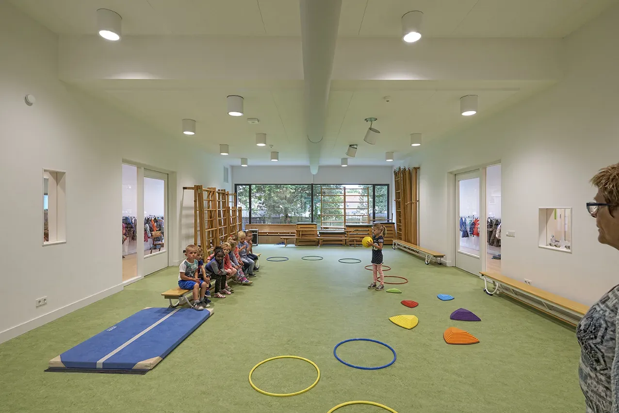 Het nieuwe schoolgebouw voldoet aan de eisen van het Frisse Scholen concept. Het is geheel uitgerust met ledverlichting. In de lokalen zijn intelligente sensoren geplaatst. Die zorgen ervoor dat overdag de lampen minder licht geven aan de raamkant dan aan de gangkant. Voor de klimaatbeheersing zijn een warmtepomp en een luchtbehandelingskast geïnstalleerd. De lamellen aan de buitenzijde zijn op onze suggestie uitgevoerd in het onderhoudsarme Accoya®. Op de vloer komt eveneens onderhoudsarm marmoleum en PVC; in het speellokaal linoleum. De wanden in de gang krijgen dik, slijtvast en afwasbaar behang.