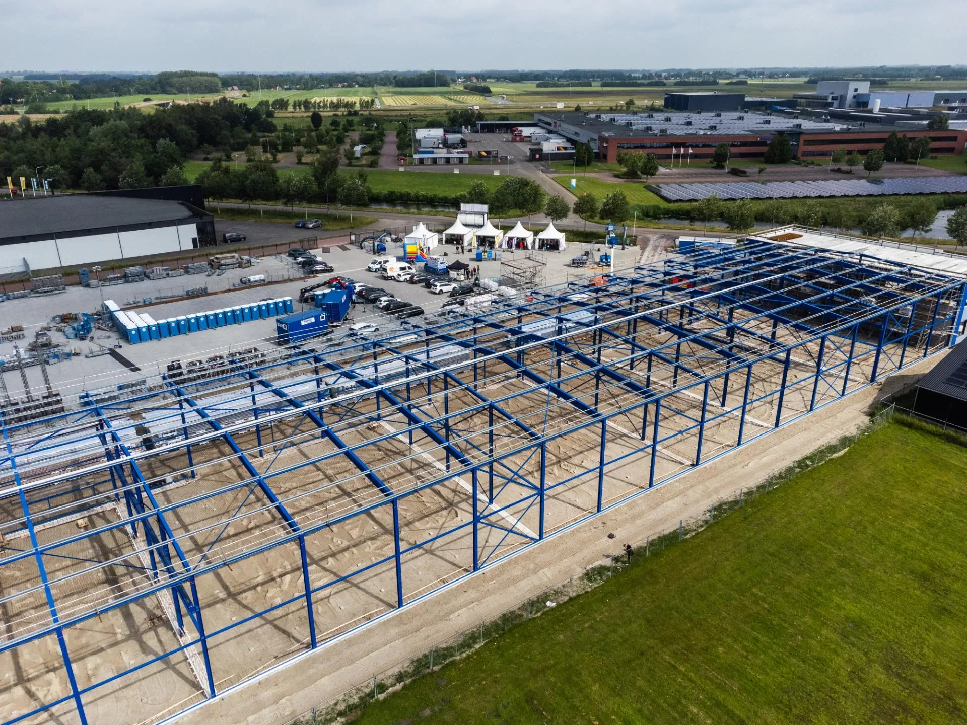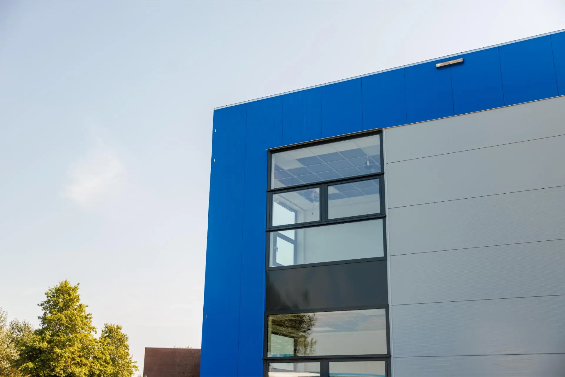 Voor dak en gevels is gekozen voor sandwichpanelen met PIR-vulling, vanwege de isolatiewaarde, duurzaamheid en bestendigheid tegen chemische invloeden. De gevels zijn uitgevoerd in de herkenbare blauwe kleur van Sijperda Verhuur, wat het pand een robuuste en moderne uitstraling geeft.