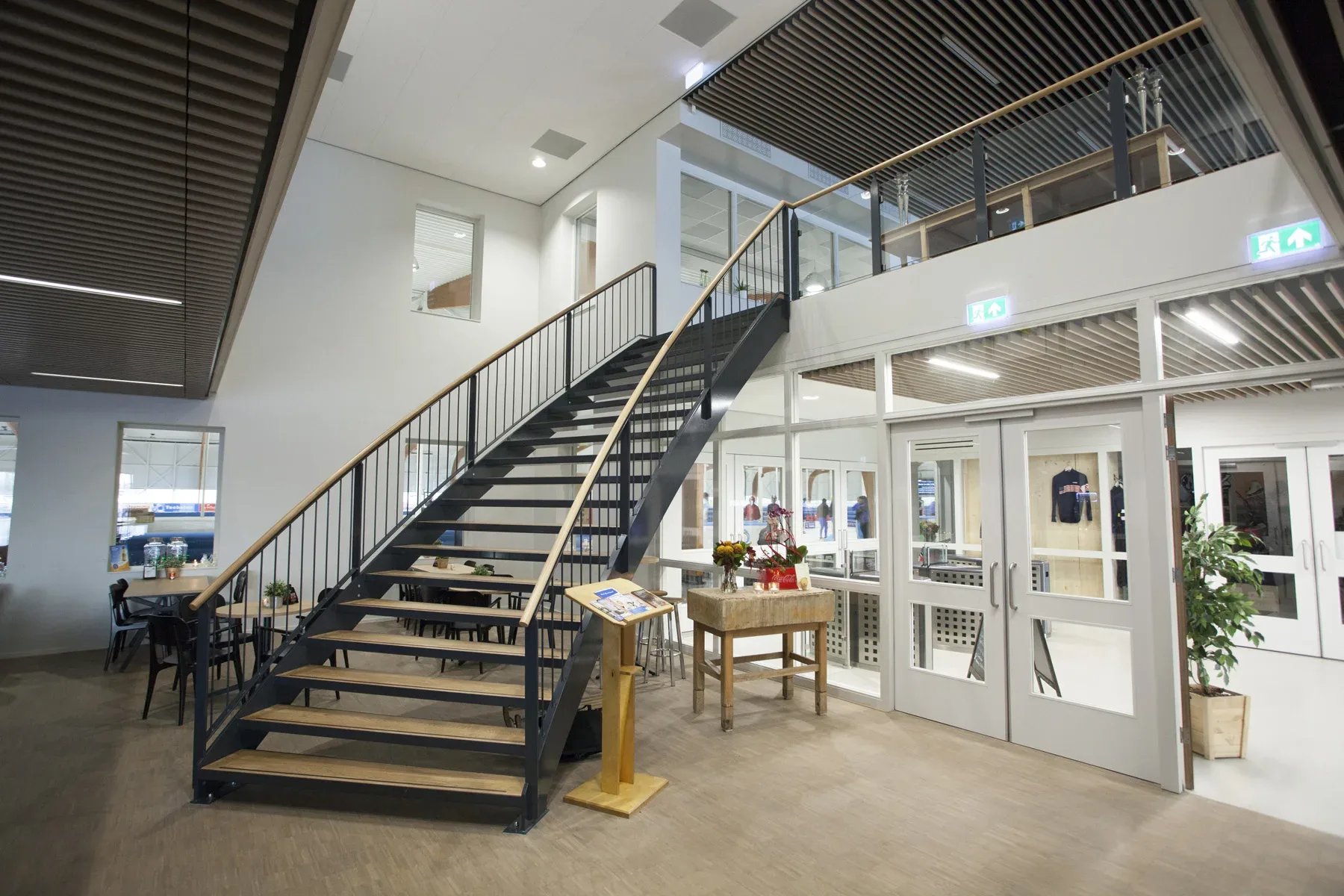 Eis van de opdrachtgever: er moest sfeer in de hal gebracht worden. Door het aanbrengen van grote larixhouten spanten en het kleurgebruik (koningsblauw met wit) is dat boven verwachting goed gelukt.