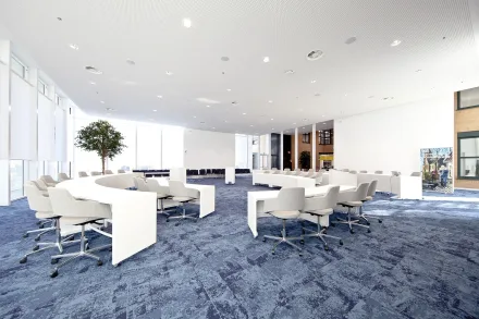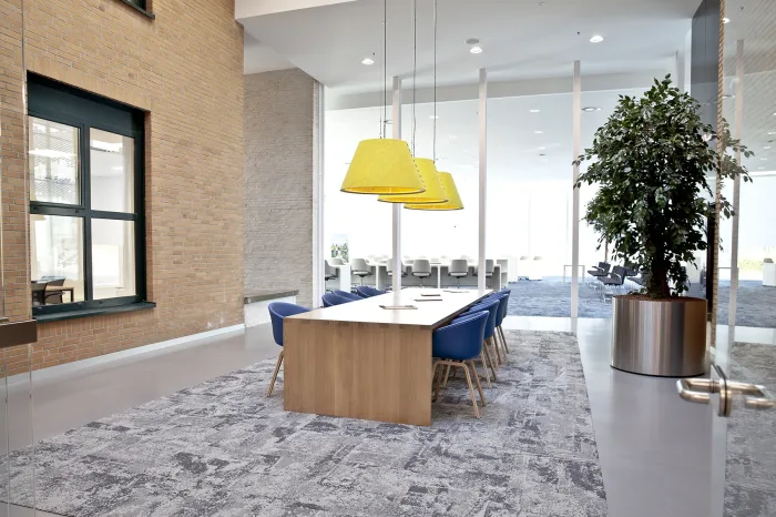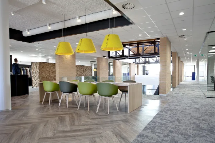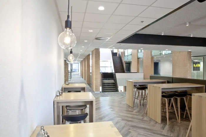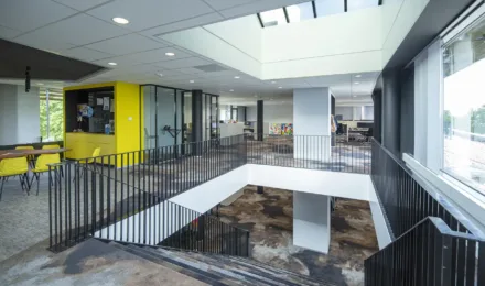 Het bestaande deel van dit voormalige gemeentekantoor van Franekeradeel is volledig gestript: de wanden, vloeren en trap zijn eruit gehaald. Met name het verwijderen van de betonnen trap was vanwege de omvang een uitdagende klus. Het gestripte deel houdt een open karakter: glazen wanden afgewisseld met enkele afgescheiden kantoorruimtes.