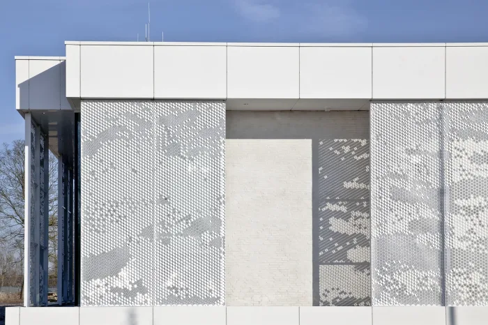 Het nieuwe gedeelte krijgt een plat dak en is in een U-vorm tegen de bestaande bouw aangezet. Dit deel zal fungeren als raadzaal en is één grote, transparante ruimte. Het ontwerp is geïnspireerd op het Waddengebied. Om dit te bereiken zijn de glazen wanden voorzien van speciale geperforeerde panelen waar het licht erg mooi doorheen valt. Passend bij het thema werken we een deel van het donkere metselwerk af met een speciale lichtgekleurde chippermortel, waardoor delen van de onderliggende gevelsteen zichtbaar blijven. Ook de gietvloer sluit aan bij het thema. Deze krijgt een coating met een craquelé-effect.