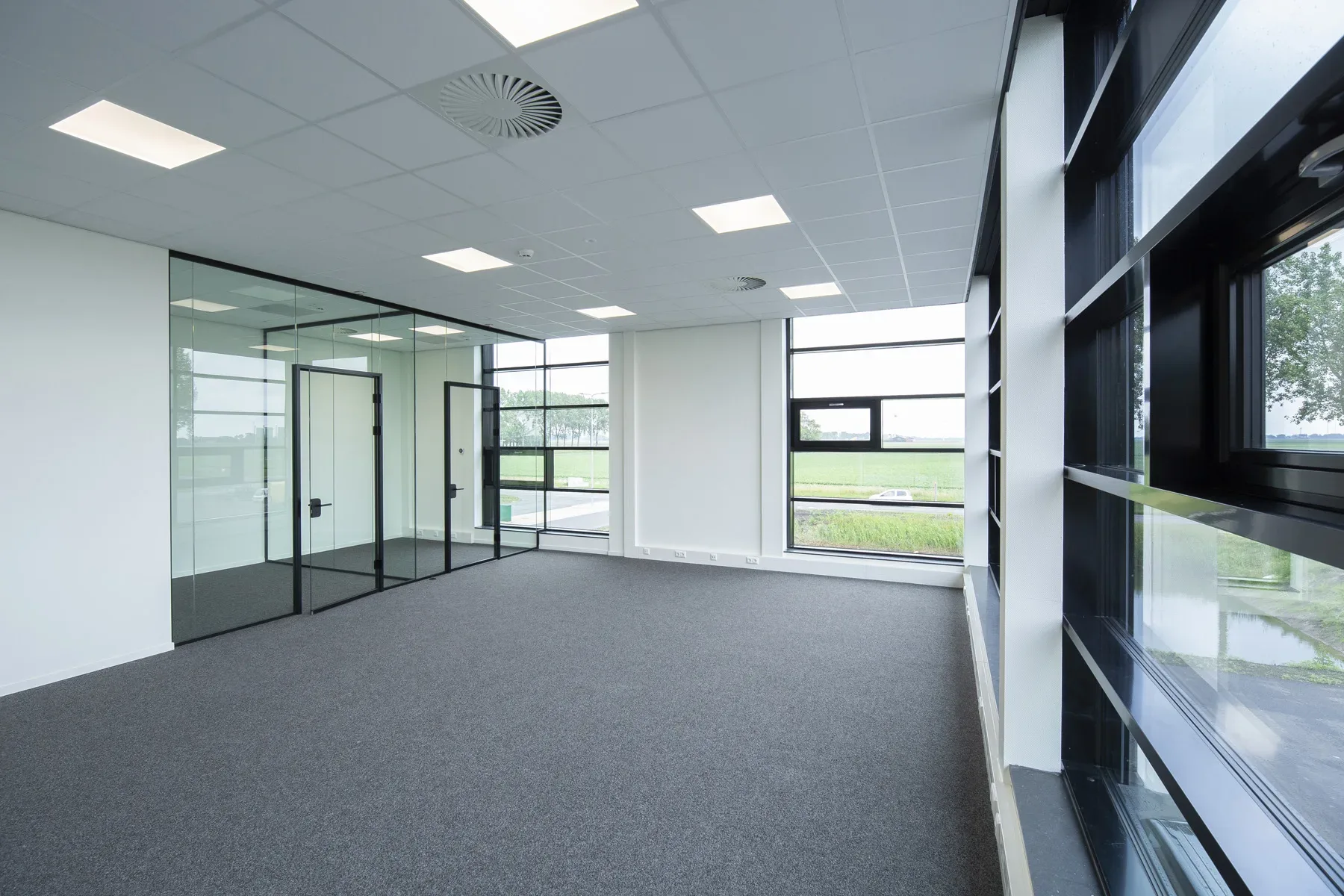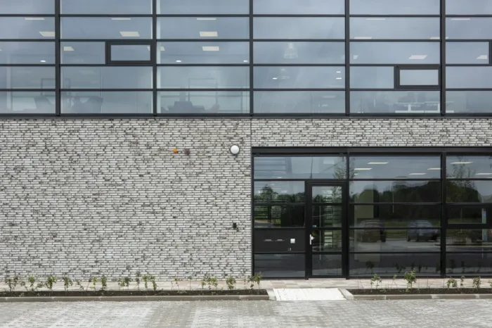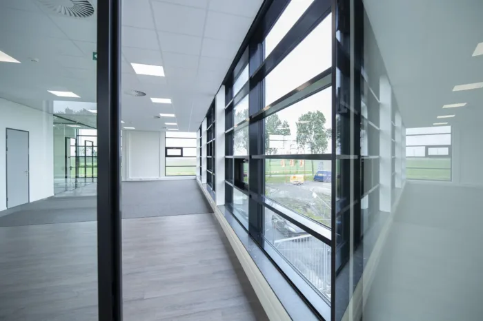 Het gebouw heeft grote glasvlakken. In de materialisatie gaf dit uitdagingen om alles goed op elkaar aan te laten sluiten. Het materiaal biedt weinig ruimte om toleranties te verbloemen. Maar ook hier hebben we ons weer de ‘bouw meester’ getoond! Middels een VRV-systeem zijn meerdere ruimtes tegelijk elektrisch te koelen of te verwarmen.