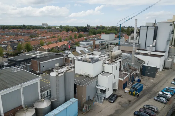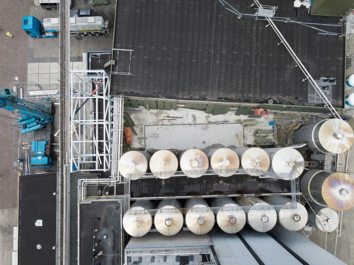 Tijdens het werk draaide de productie gewoon door. We hadden dus rekening te houden met de aanvoer van melk en de afvoer van poederproducten, maar ook met de hygiëneprotocollen die de fabriek hanteert. Zoals we gewend zijn bij dergelijke going on concern-situaties verzorgden wij de afstemming met de (veiligheids)functionarissen van de fabriek, zodat de bouw- én de fabriekswerkzaamheden goed naast elkaar konden plaatsvinden. Dit garandeerden we onder meer door bepaalde zones af te schermen met hermetisch afgesloten stofschermen. Ook verzorgden we een tijdelijke kleedruimte voor de fabrieksmedewerkers in units, inclusief een gang naar hun werkruimtes.