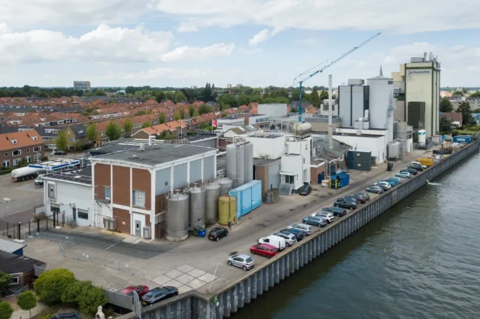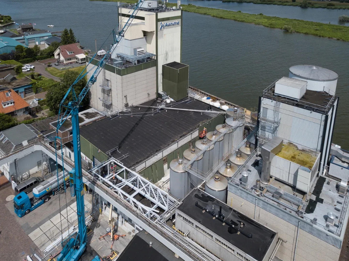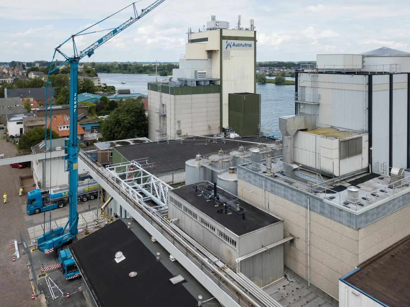 De melkpoederfabriek in Kampen ligt ingesloten tussen de IJssel en een woonwijk. We hadden enerzijds te maken met restricties vanuit het waterschap – we mochten bijvoorbeeld geen kraan plaatsen op de kade. Anderzijds was het onze zorg dat de omwonenden zo min mogelijk overlast van onze werkzaamheden zouden ondervinden. Dit laatste hebben we onder meer opgelost door voor acht uur ’s ochtends geen transport- en kraanbewegingen uit te voeren. Onze medewerkers parkeerden buiten de wijk en gingen vervolgens met een pendelbusje naar de fabriek.