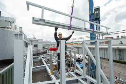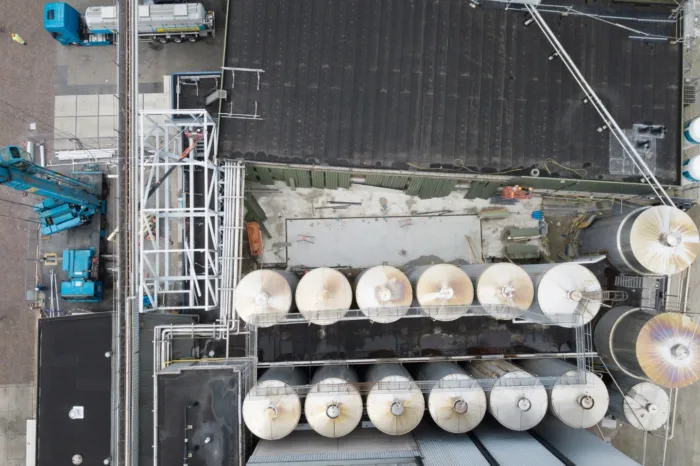 Daarbij hoorde ook de bouw van een extern trappenhuis. Verder bouwden we een nieuwe werkplaats voor de technische dienst en verzorgden we de aanleg van de fundering voor nieuwe opslagtanks tussen twee gebouwdelen in. Ook hebben we een nieuwe MCC-ruimte (MCC = Motor Control Center) op het dak van een verbindingsgang tussen twee productieruimtes ontwikkeld en uitgewerkt. Deze ruimte wordt binnenkort gebouwd.