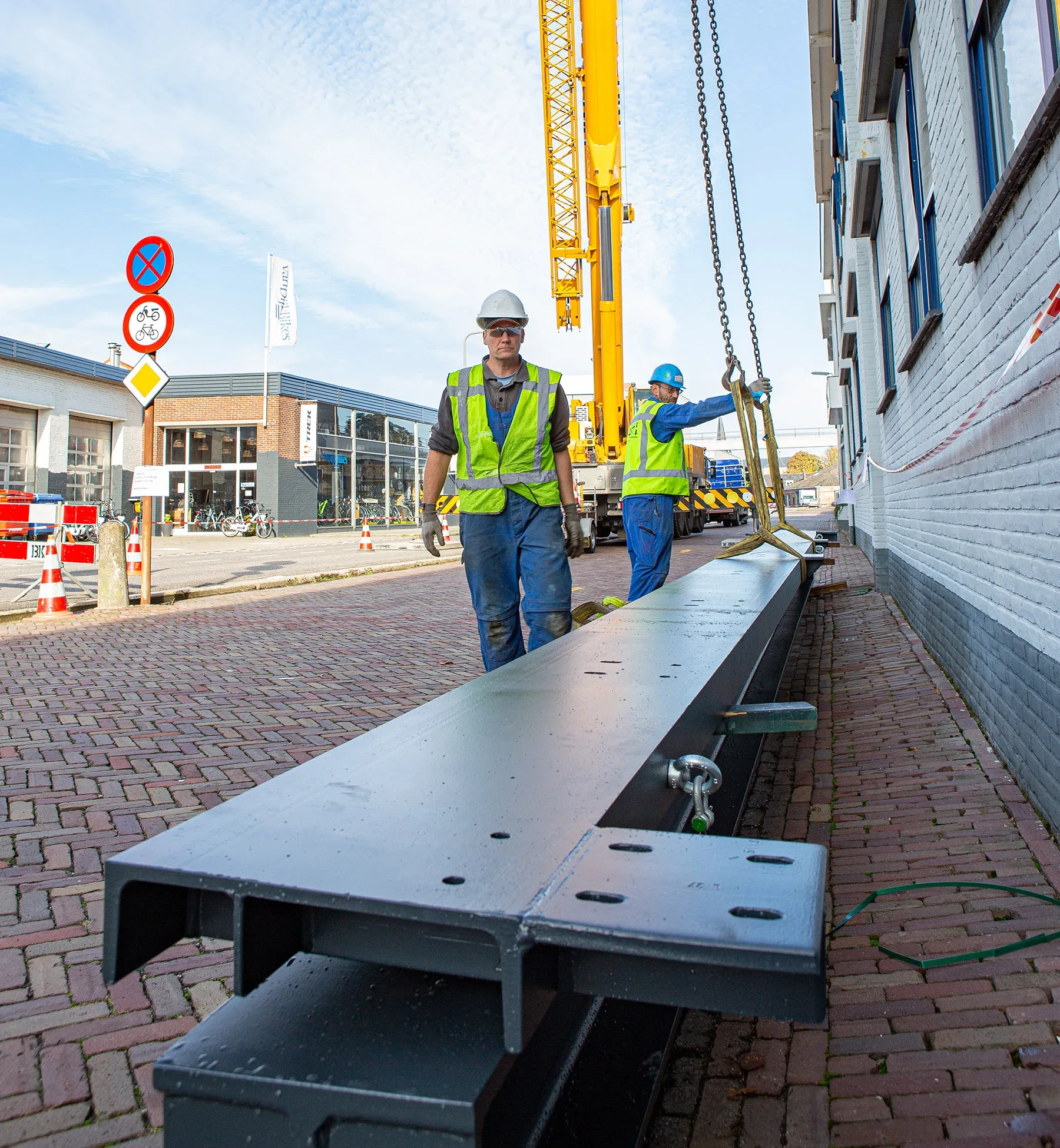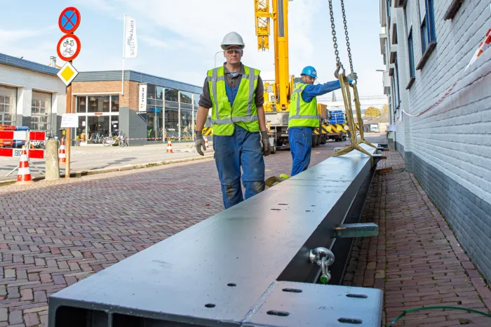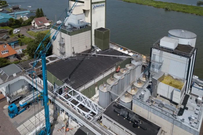 In de tussentijd moest niet alleen het dak tijdelijk worden opgevangen, maar ook een niet-zelfdragende betonbalk die op het spant rustte. Samen met onze partners ontwikkelden we een stempelplan en een sloop- en hijsmethodiek, waarna we op één zaterdag de hele vervangingsoperatie uitvoerden. Hieraan kwam onder meer een grote bouwkraan te pas, die twee kleinere kranen door het dak de fabriek in tilde. Deze zogenoemde Hoeflons namen de stalen balk over zodra die door de grote kraan naar binnen werd gehesen. Een spectaculaire klus die alleen soepel kon verlopen dankzij optimale communicatie in het voortraject!
