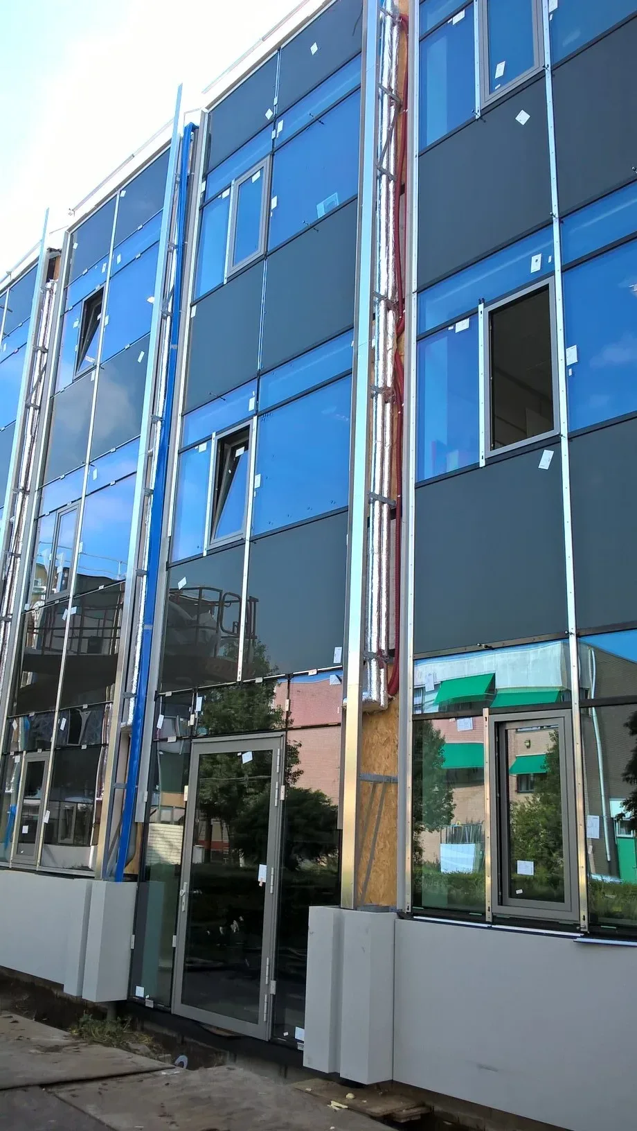 Onze bouwpartner Engie is verantwoordelijk voor het installatiedeel. De plafonds in het gebouw zijn laag en van beton. Leidingen kunnen daarom niet door het gebouw heen, maar komen langs de gevel. Daarnaast komen er luchtbehandelingskasten op het dak. Van daaruit gaan luchtkanalen over het dak, en per gevelstramien (om de 3,6 m) via zakkanalen naar de verdiepingen eronder. Op de plaatsen waar die kanalen door de gevel naar binnen komen, maken we een koof. Van daaruit wordt de frisse lucht het lokaal in geblazen. Om het installatiewerk op de gevel komt een koof van alucobond, waarmee we e.e.a. strak kunnen afwerken.